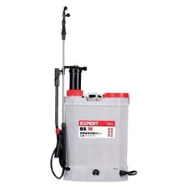 - Expert BS 16 je praktična i višenamenska leđna prskalica koja kombinuje prednosti akumulatorskog i ručnog sistema rada. Opremljena je snažnom 12V / 8Ah baterijom koja omogućava do 5 sati neprekidnog rada, dok se nakon pražnjenja može koristiti i kao ručna prskalica pomoću ugrađene ručne pumpe. Idealan je izbor za baštovane, vinogradare i sve koji traže pouzdan alat za prskanje većih površina. Rezervoar zapremine 14 litara obezbeđuje dugotrajan rad bez čestog dolivanja, a teleskopska cev sa rasponom od 80 do 120 cm i fleksibilno crevo dužine 125 cm omogućavaju pristup i teško dostupnim mestima. Prskalica ima voltmetar za vizuelnu kontrolu napunjenosti baterije, kao i više dizni za različite potrebe prskanja – konusnu, duplu i tuš diznu.