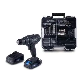- Bušilica koristi litijum-jonsku bateriju od 20 V/2,0 Ah koja ne pati od memorijskog efekta i samopražnjenja, dok LED radno svetlo i indikator napunjenosti baterije dodatno olakšavaju rad u nepovoljnim uslovima. U kompletu dolazi čak 74 dela pribora, uključujući burgije, bitove, nasadne ključeve i dodatni alat, upakovano u robusni kofer koji omogućava lako skladištenje i prenos.
