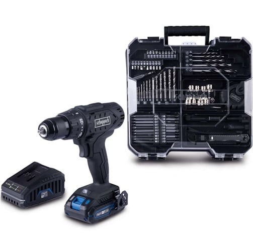 - Bušilica koristi litijum-jonsku bateriju od 20 V/2,0 Ah koja ne pati od memorijskog efekta i samopražnjenja, dok LED radno svetlo i indikator napunjenosti baterije dodatno olakšavaju rad u nepovoljnim uslovima. U kompletu dolazi čak 74 dela pribora, uključujući burgije, bitove, nasadne ključeve i dodatni alat, upakovano u robusni kofer koji omogućava lako skladištenje i prenos.
